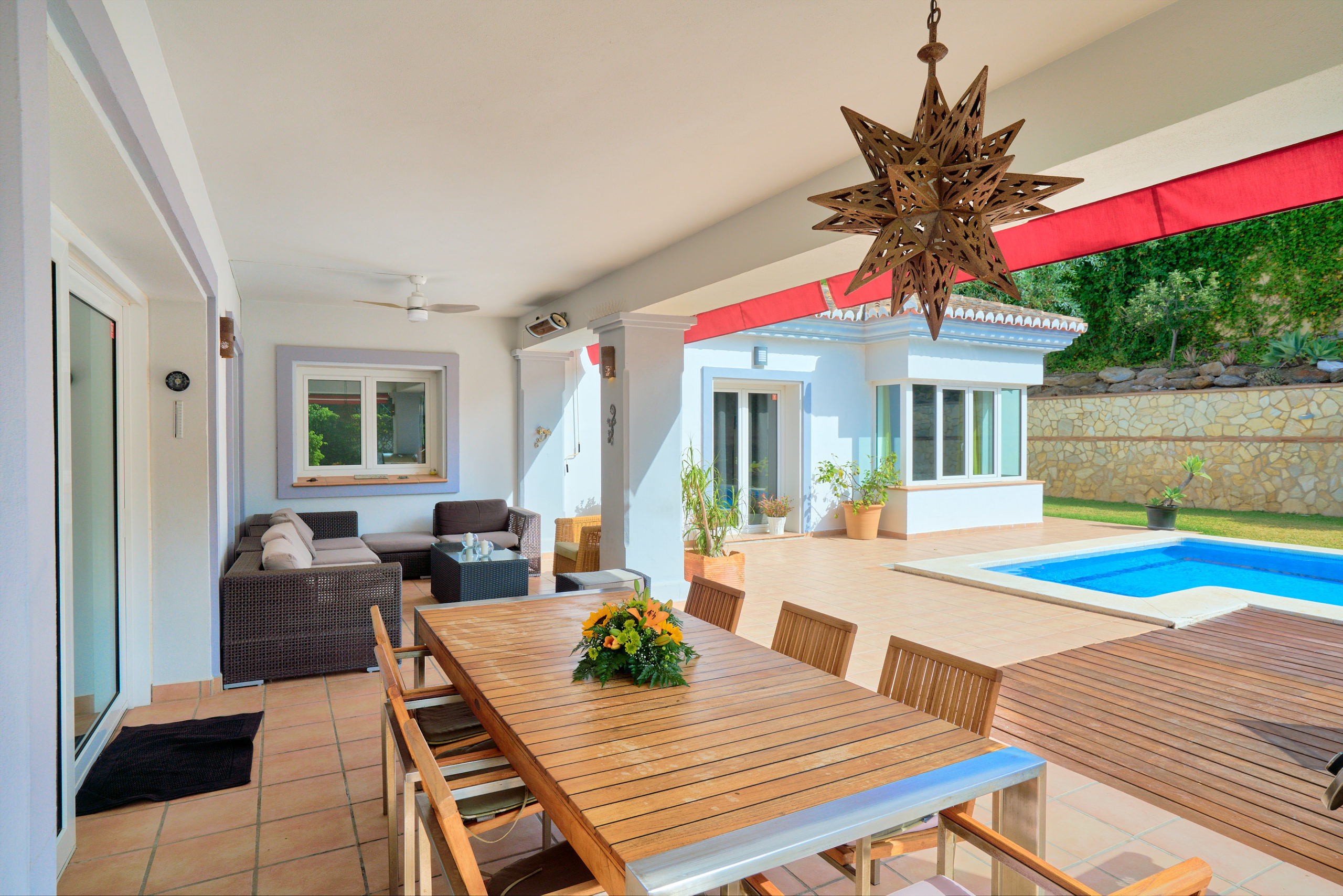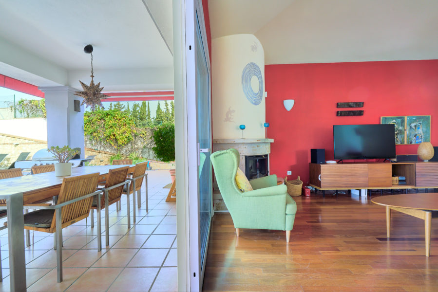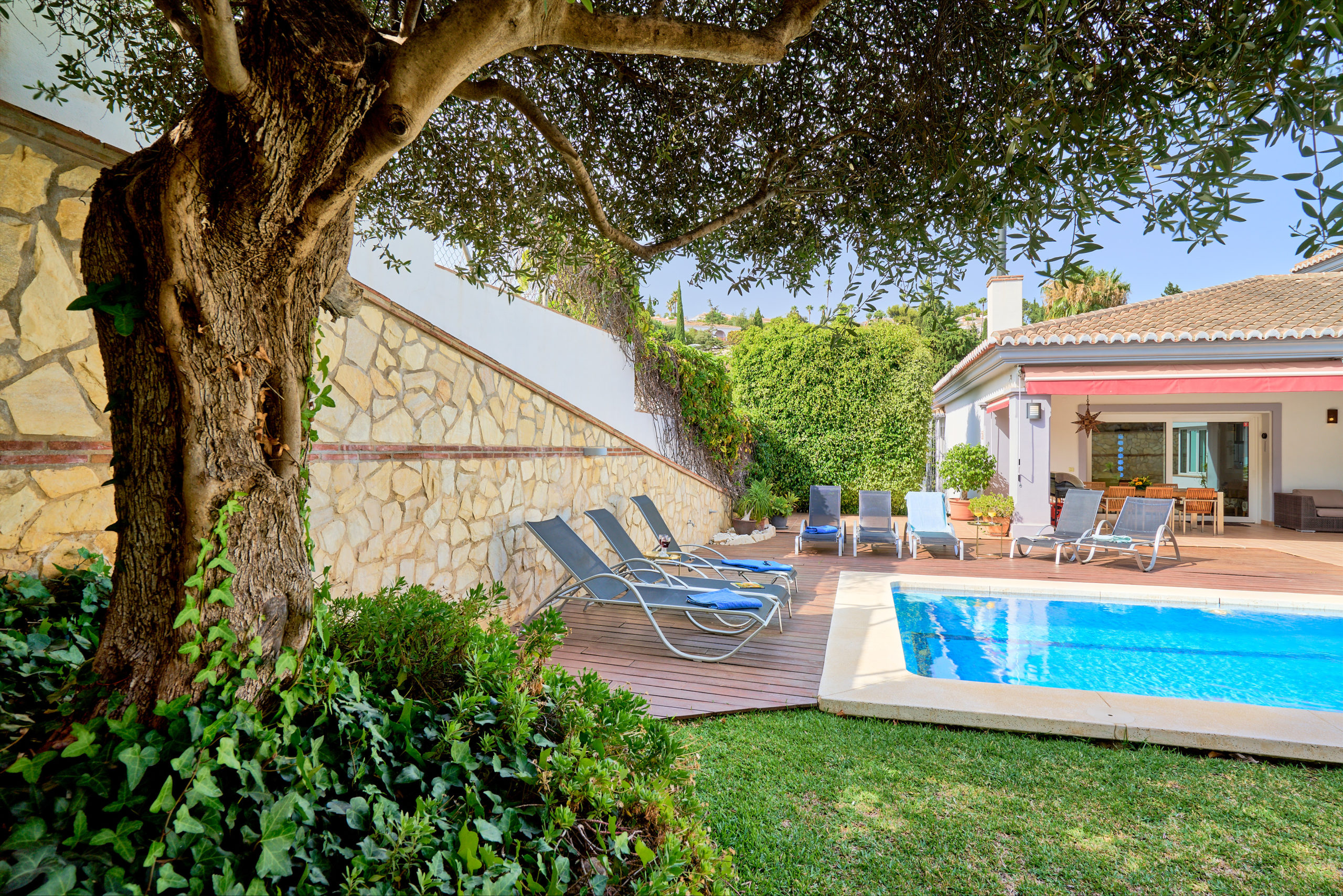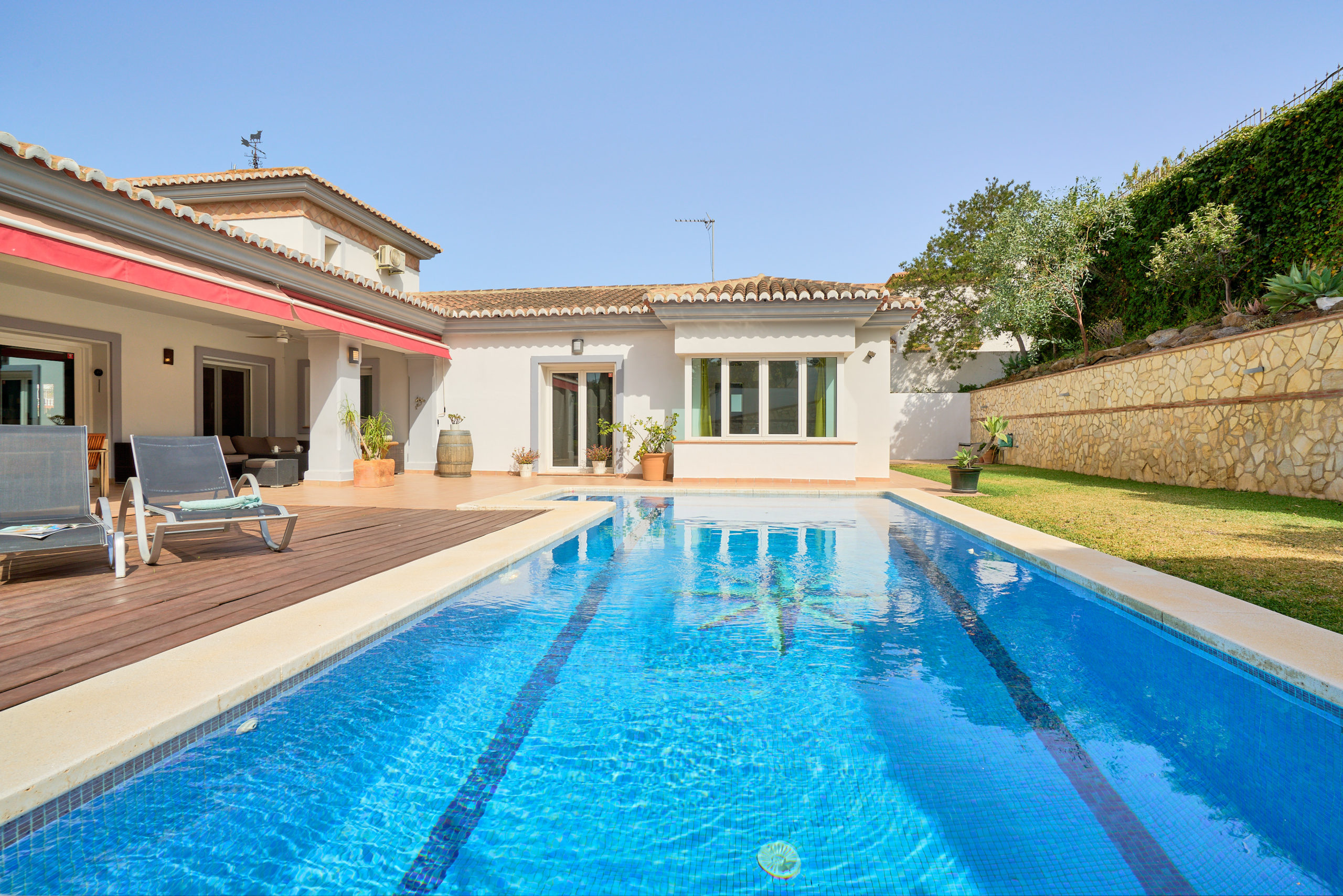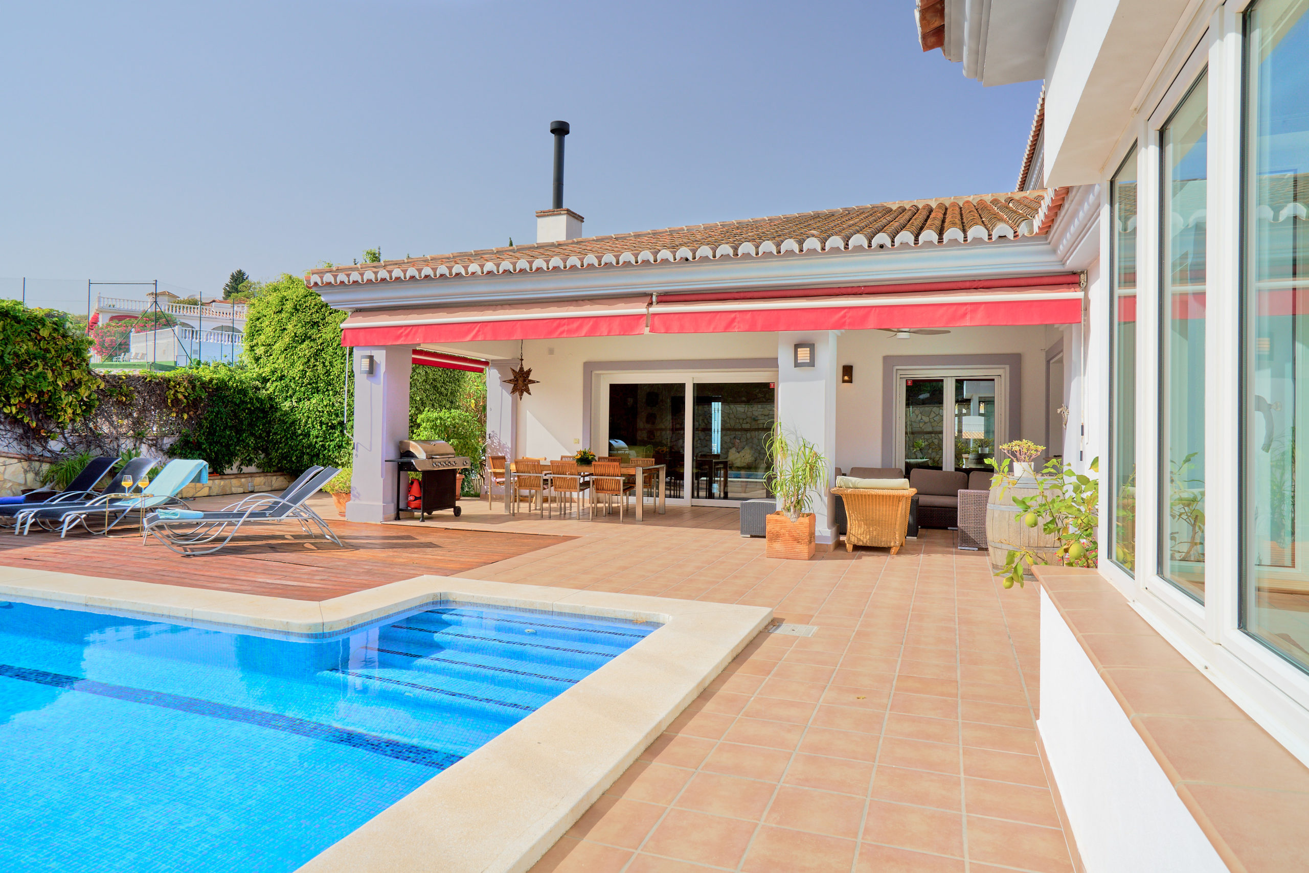 Magnificent detached villa in the area of La Sierrezuela in Mijas Costa. Villa Lagarto will delight you. This fabulous luxury villa is situated on a corner plot of 1098 m2 with views to Mijas Costa and Fuengirola. The plot has total privacy for you to enjoy your home in total tranquility. The house has a total built area of 503 m2 plus a private garage of 59 m2 and a living area of 428 m2. There are a total of 5 bedrooms and 4.5 bathrooms, including a guest room located in the semi-basement. The main floor has a large open plan kitchen, dining and living room with a library and from the living room you have direct access to the entertainment area with wooden decked swimming pool around it. There is a nice terrace next to the kitchen, a hallway leads to the bedrooms, where you have the master bedroom with en-suite bathroom and dressing room and two additional bedrooms sharing a bathroom. There is also a guest toilet and a laundry room on this floor. An interesting feature of this floor are the wooden floors. A staircase leads to the tower bedroom with its own bathroom and private terrace. In the semi-basement we have the guest suite with private bathroom, a large living room with home cinema, gym and games room, a wine cellar, storage room and a large private garage. The house is built to the highest standards and qualities, with air conditioning throughout the house, under floor heating in the bathrooms and security glass in windows and doors. Don’t miss this great opportunity to live in a luxurious family residence in one of the best areas of Mijas Costa.